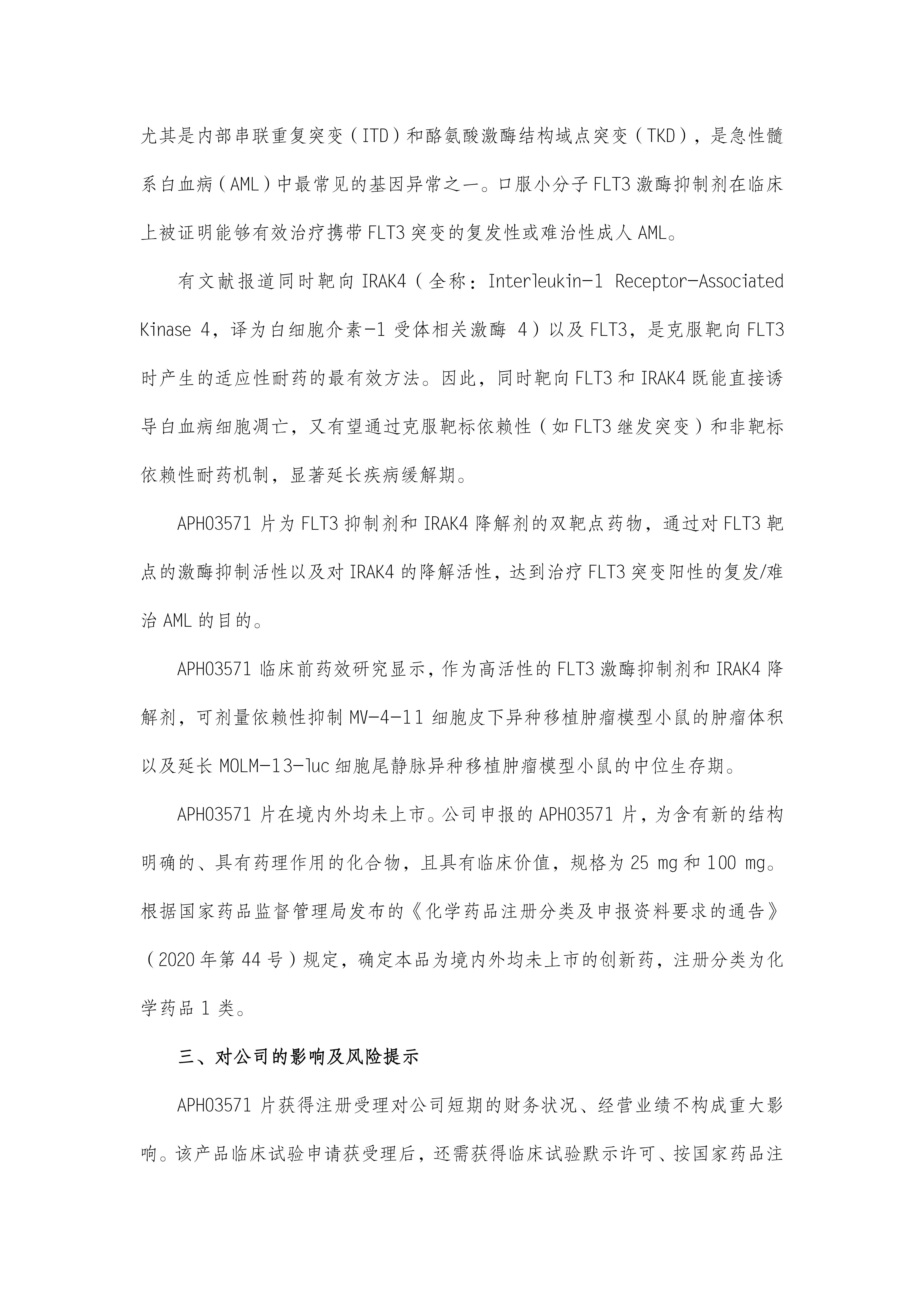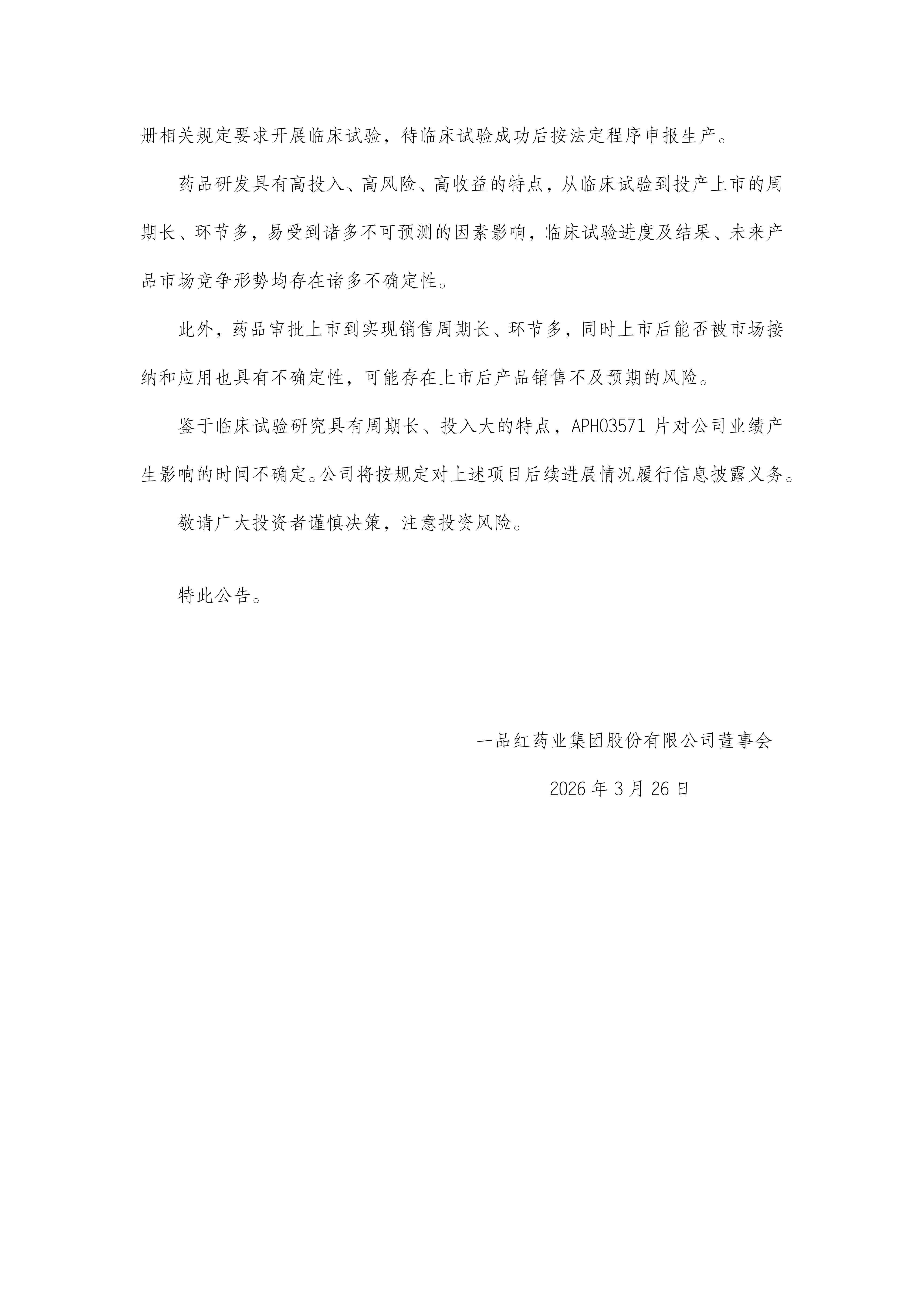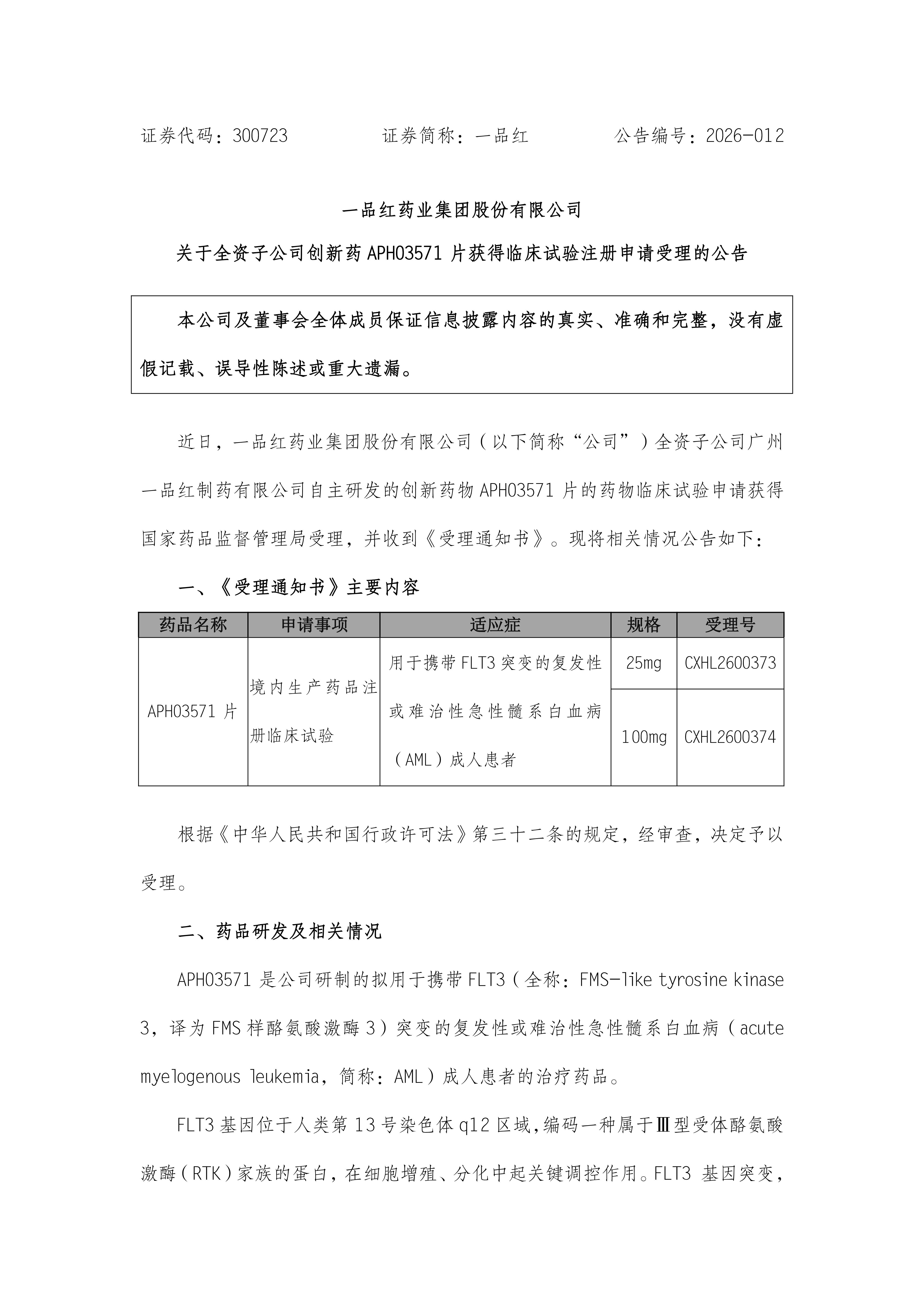 根據(jù)《一品紅藥業(yè)集團(tuán)股份有限公司關(guān)于全資子公司創(chuàng)新藥APH03571片獲得臨床試驗(yàn)注冊(cè)申請(qǐng)受理的公告》(公告編號(hào):2026-012),現(xiàn)予以公告。