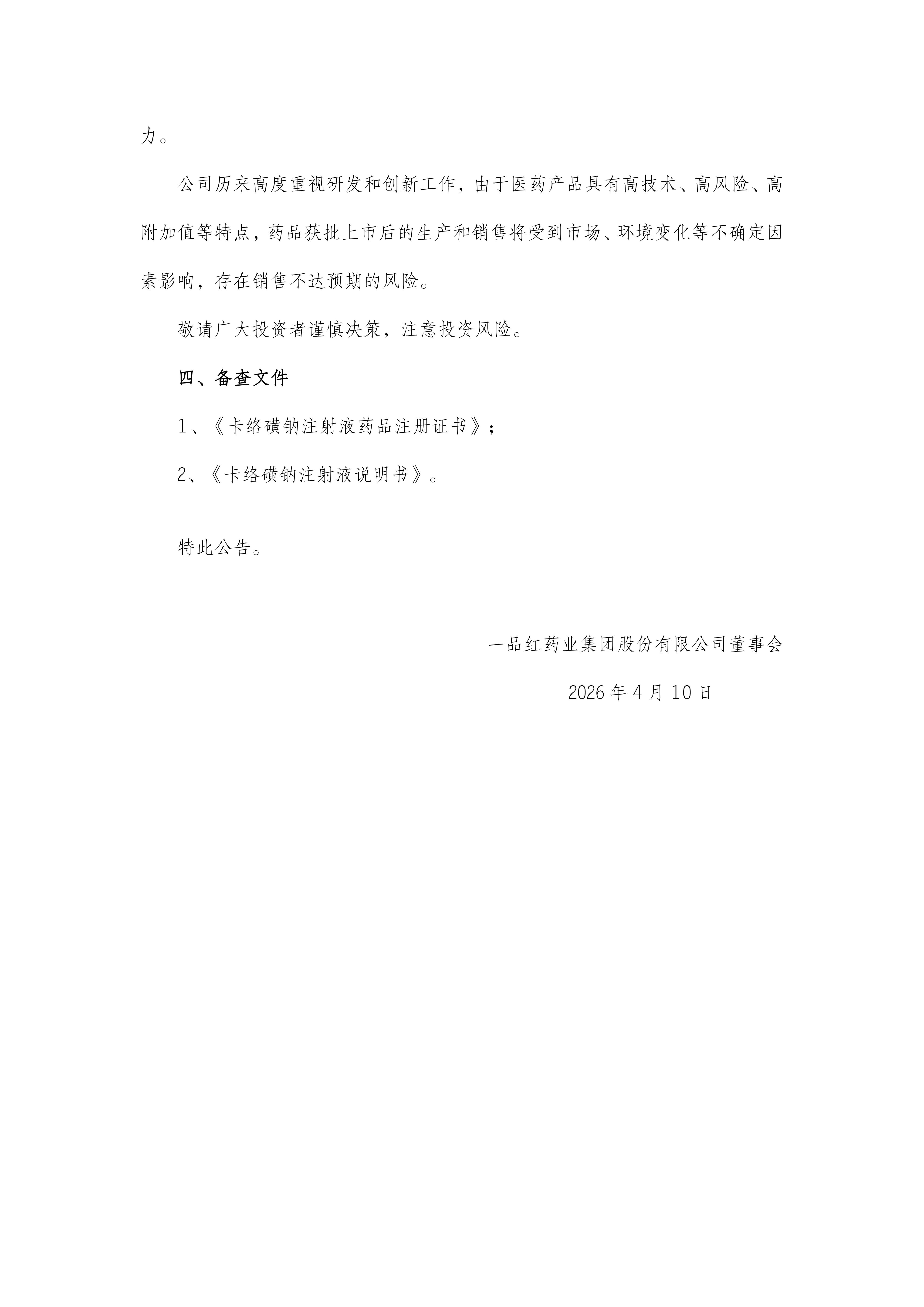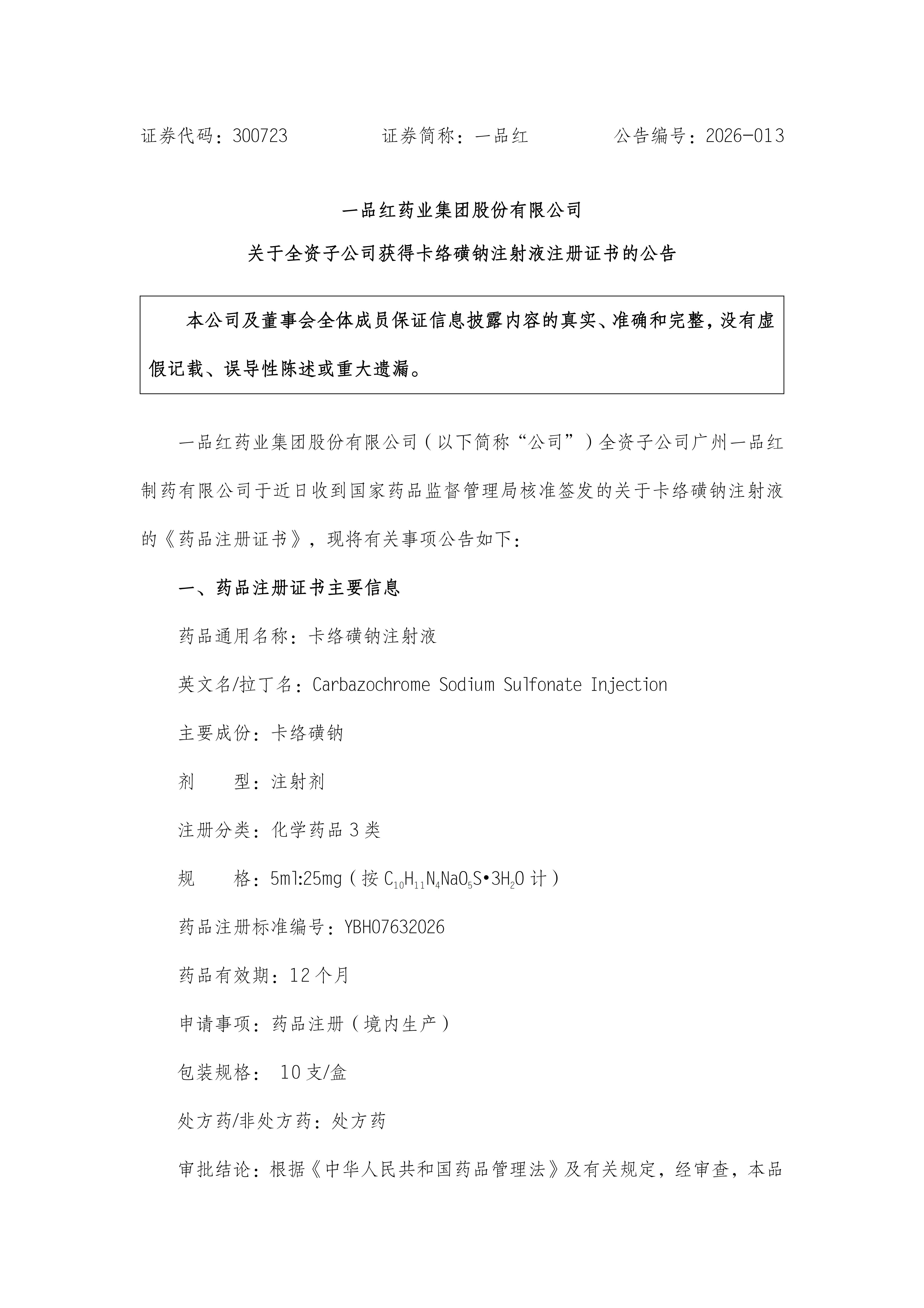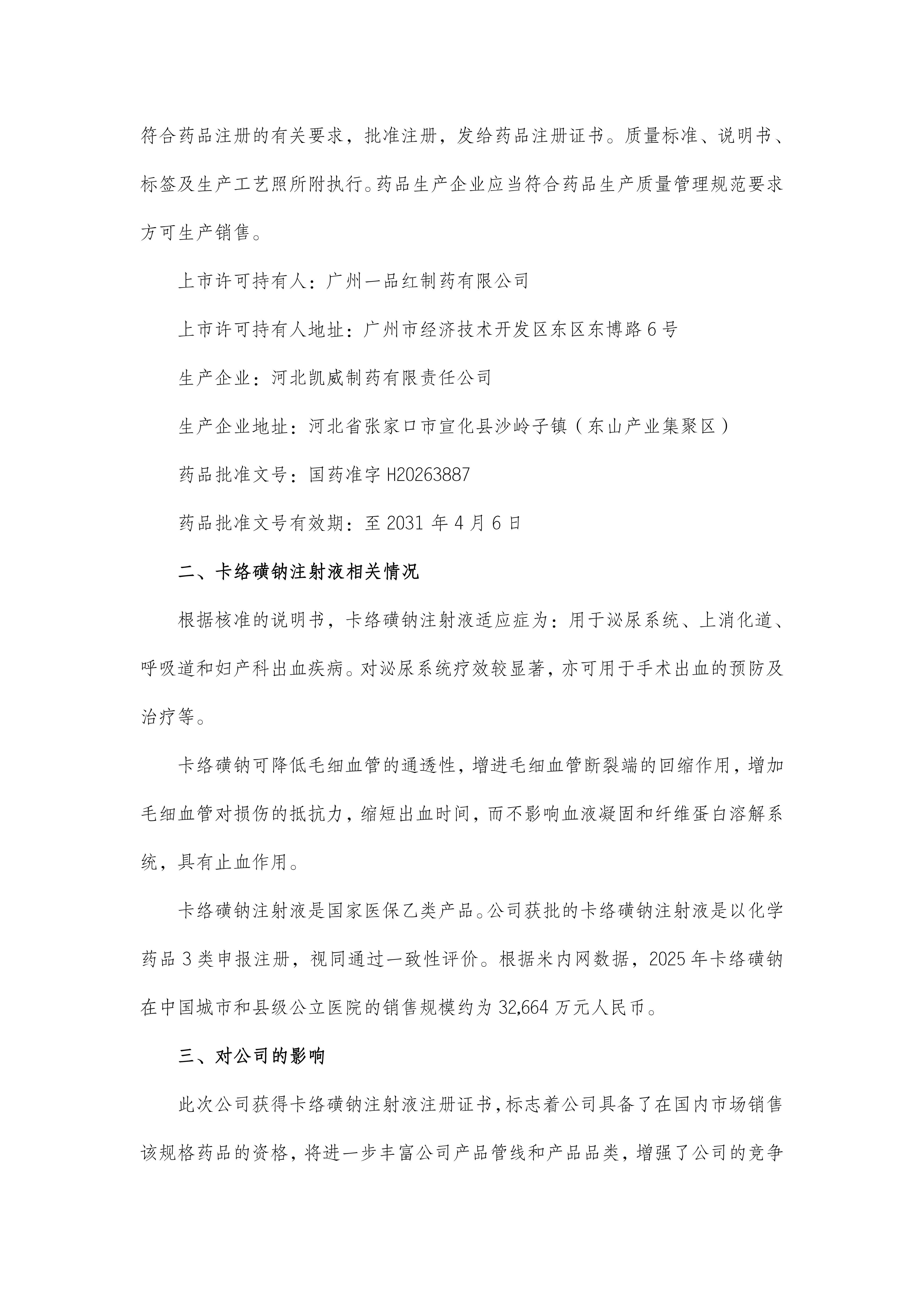 根據(jù)《一品紅藥業(yè)集團(tuán)股份有限公司關(guān)于全資子公司獲得卡絡(luò)磺鈉注射液注冊(cè)證書的公告》(公告編號(hào):2026-013),現(xiàn)予以公告。